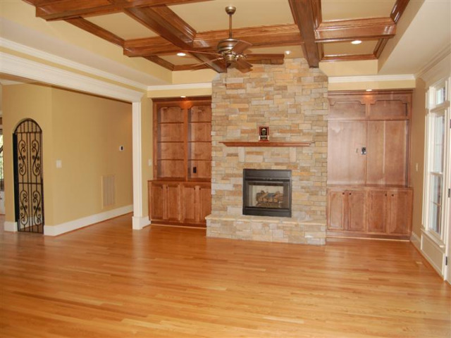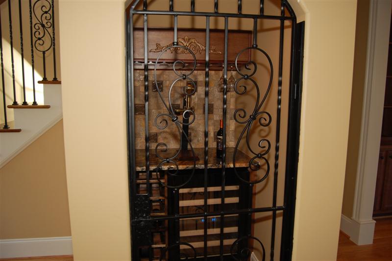 The homeowner designed a very unique wine room under the staircase with granite counter top, wine cooler and wrought iron gate. The open floor plan allows for great flow both inside and out while entertaining. The living room has a cozy feeling with built in cabinets, stained oak coffered ceiling, floor to ceiling stone fireplace with slate hearth and French doors that open to the outside deck which is flanked by a pergola off the master and screened porch off the kitchen and nook.